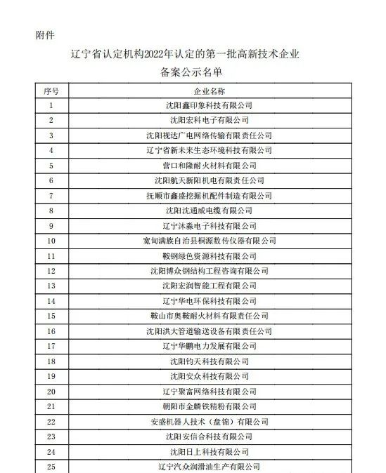 根据《高新技术企业认定管理办法》(国科发火〔2016〕32号)和《高新技术企业认定管理工作指引》(国科发火〔2016〕195号)有关规定,现将辽宁省认定机构2022年认定的第一批535家高新技术企业(企业名单详见附件)进行备案公示,公示期为10个工作日。