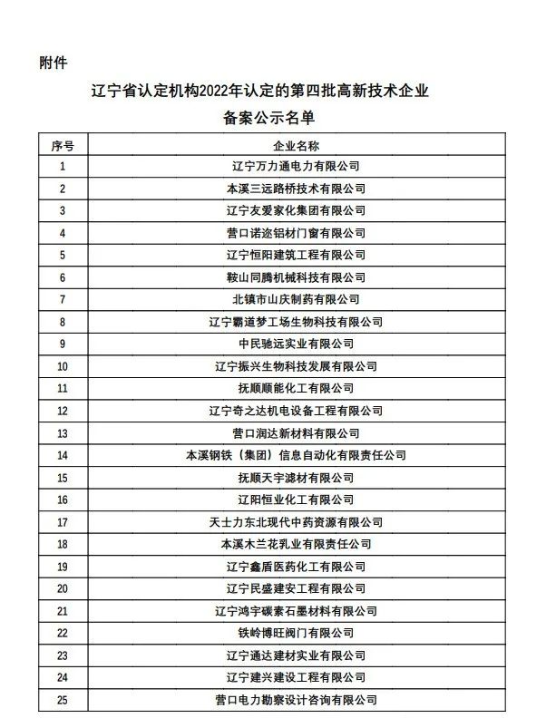 根据《高新技术企业认定管理办法》(国科发火〔2016〕32号)和《高新技术企业认定管理工作指引》(国科发火〔2016〕195号)有关规定,现将辽宁省认定机构2022年认定的第四批35家高新技术企业(企业名单详见附件)进行备案公示,公示期为10个工作日。